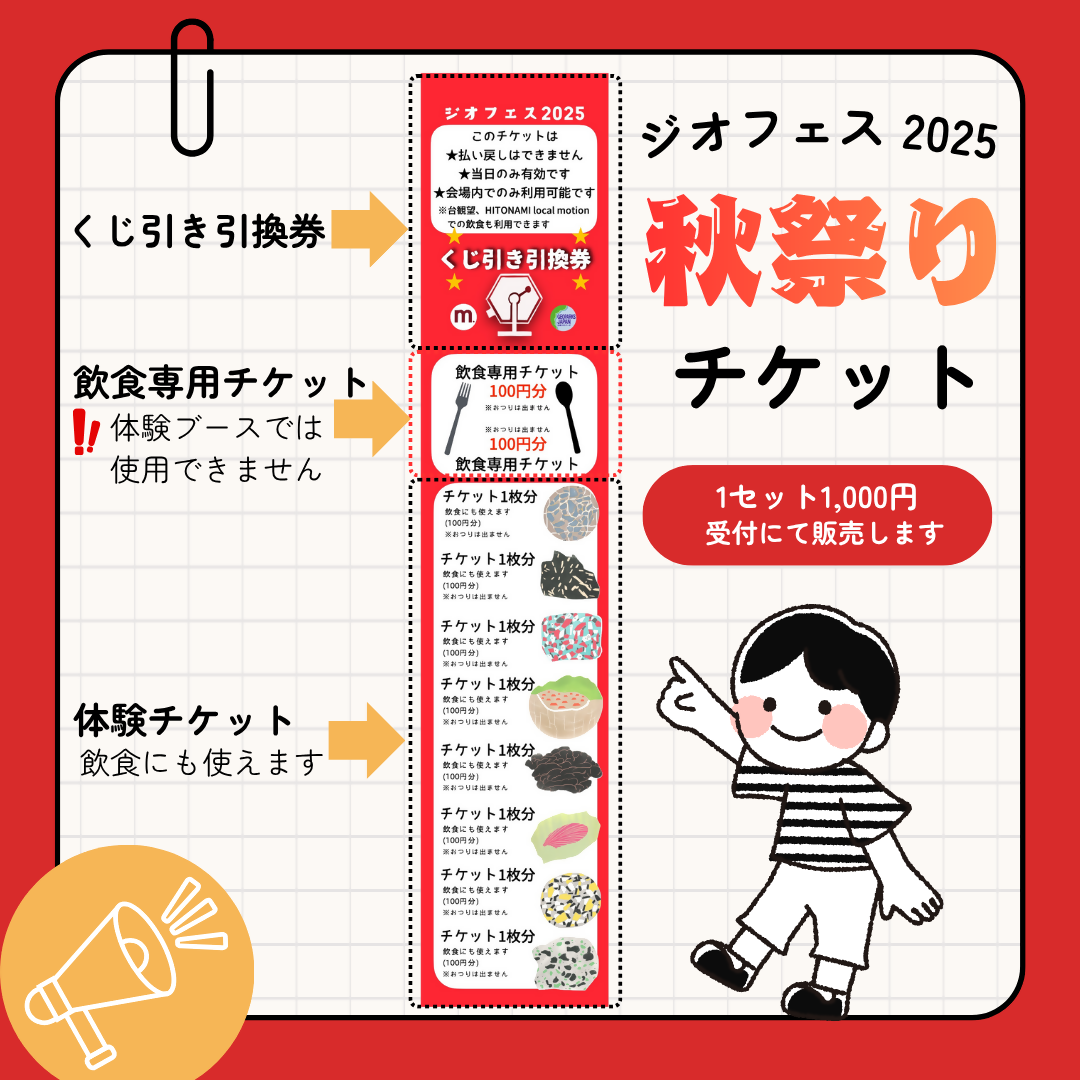 ※チケット1セット11枚綴 (くじ引き券1枚、飲食専用券2枚、飲食・体験ブース共通券8枚)