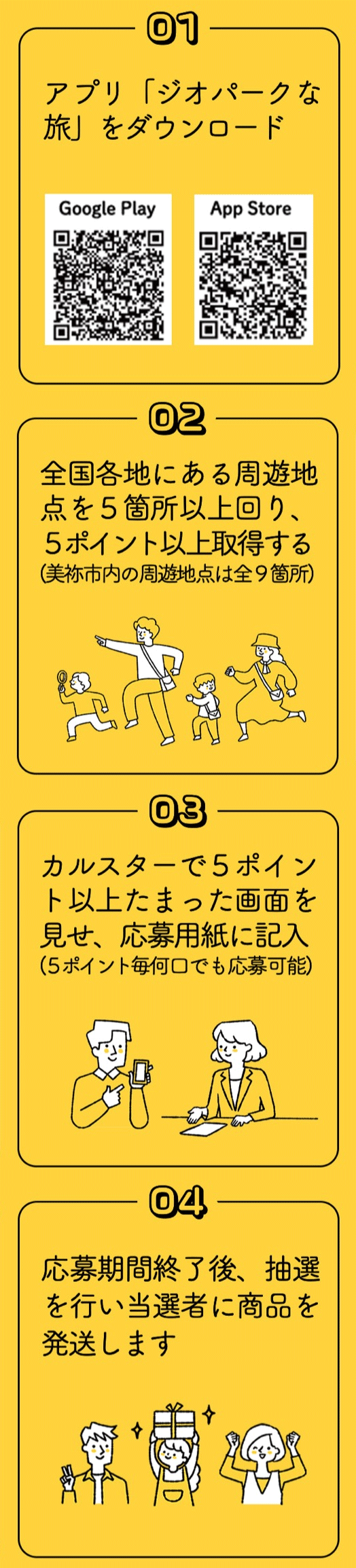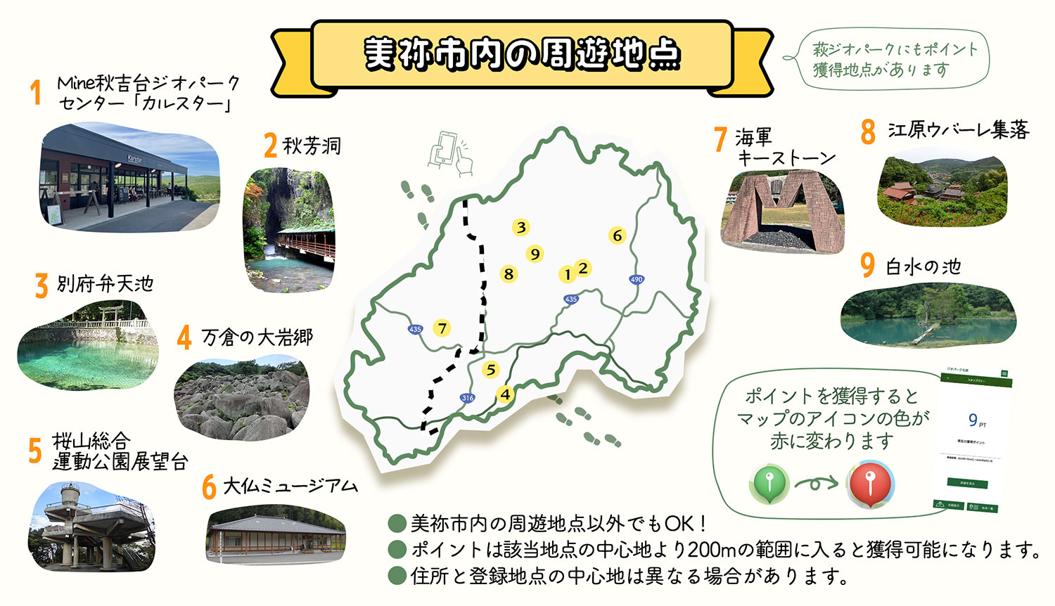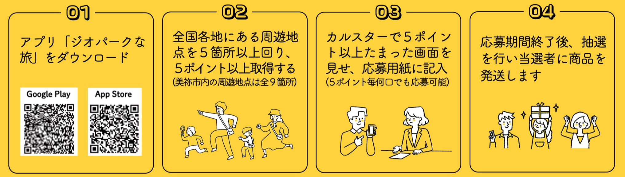 令和7年12月1日〜令和8年2月28日の間、無料アプリ「ジオパークな旅」を使った周遊イベントを開催します!「ジオパークな旅」アプリを使ってジオパークの見どころを巡り、ポイントを集めると、Mine秋吉台ジオパークパートナーの景品が抽選で当たります。
