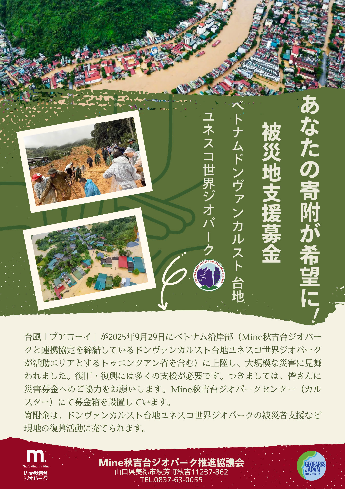 台風「ブロアイ」が2025年9月29日にベトナム沿岸部(Mine秋吉台ジオパークと連携協定を締結しているドンヴァンカルスト台地ユネスコ世界ジオパークが活動エリアとするトゥエンクアン省を含む)に上陸し、大規模な災害に見舞われました。復旧・復興には多くの支援が必要です。つきましては、皆さんに災害募金へのご協力をお願いします。 募金箱はMine秋吉台ジオパークセンター Karstar(カルスター)に設置されています。